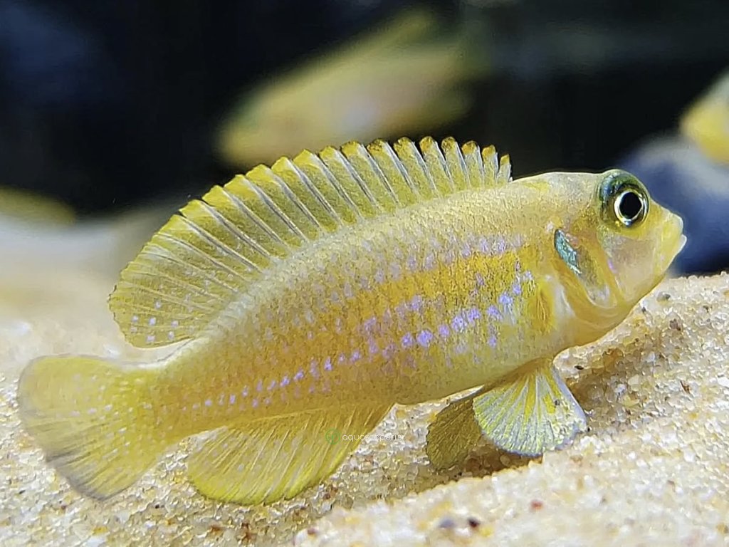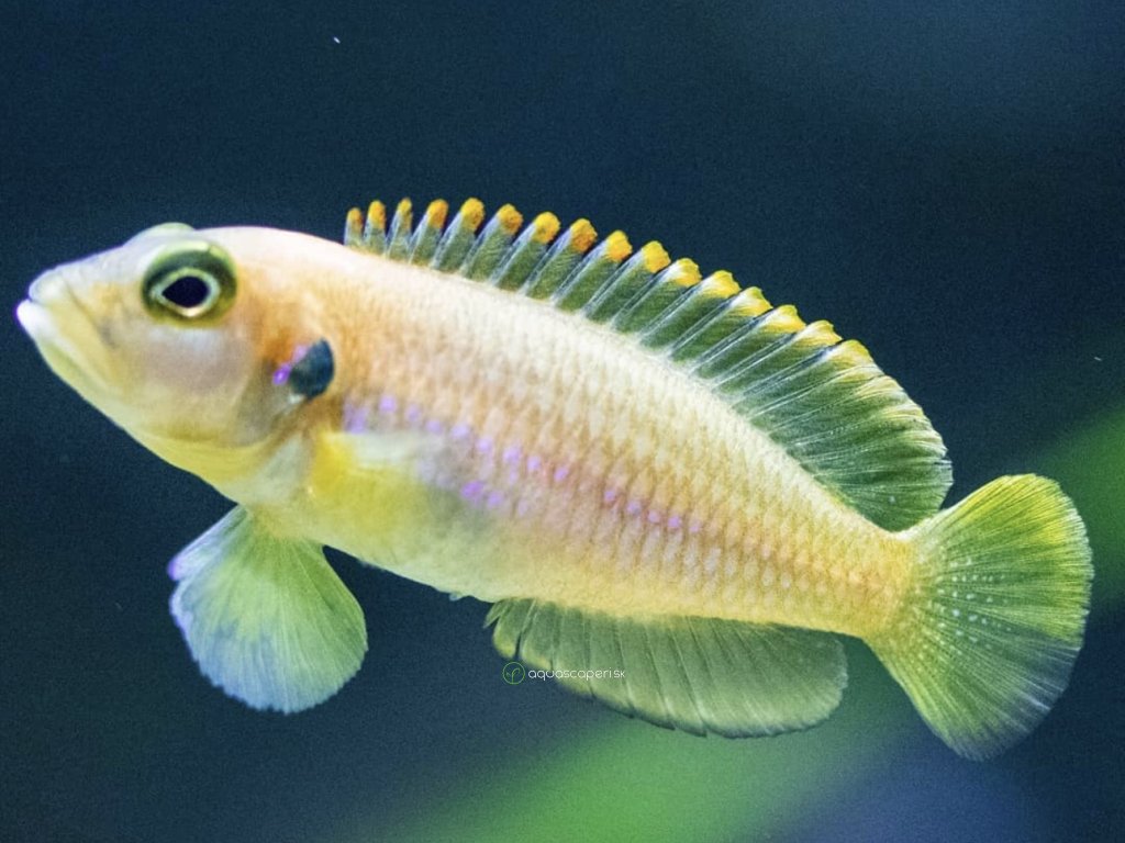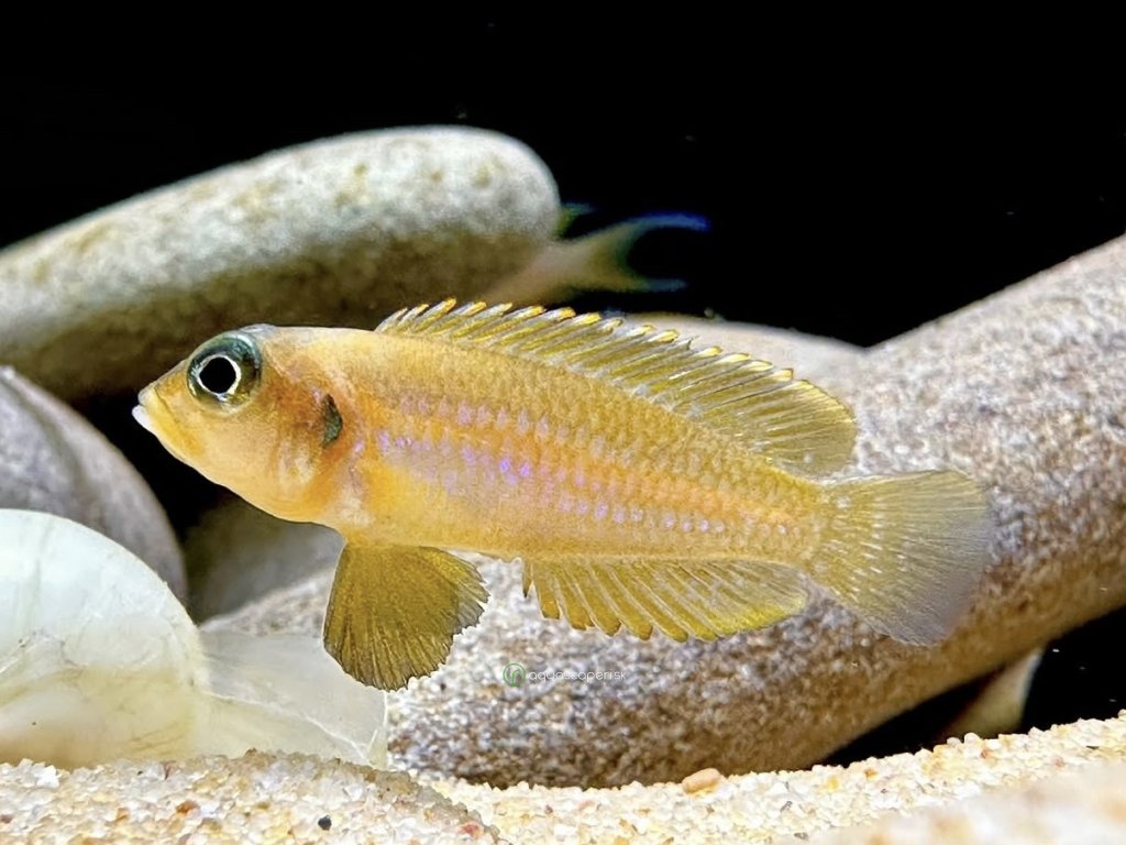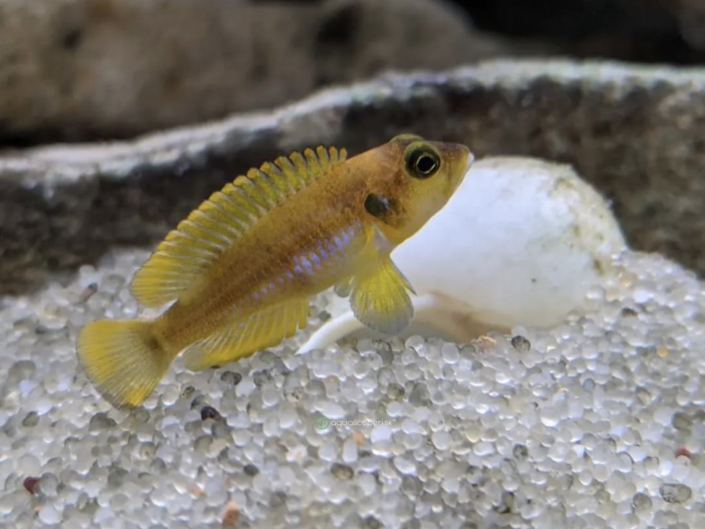 Lamprologus ocellatus Gold je malý, ale veľmi atraktívny druh cichlidy, ktorý dosahuje maximálnu dĺžku približne 5–6 cm. Telo tejto ryby je štíhle, s veľmi výrazným zlatým sfarbením, ktoré je zdobené jemnými tmavými pruhmi a bodkami. Tento zlatý odtieň sa intenzívnejšie objavuje počas obdobia rozmnožovania, čo ešte viac zvyšuje atraktivitu týchto rýb. Okrem svojho krásneho vzhľadu má Lamprologus ocellatus Gold tiež očarujúce „ocelové“ oči, ktoré sú kontrastné s jeho žiarivým telom.