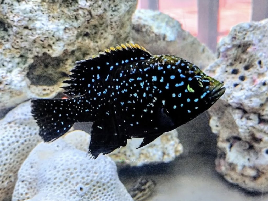 Dorastá do veľkosti 20–30 cm, preto je vhodná len do veľkých akvárií. Má výraznú hlavu, mohutné telo a silné čeľuste, čo ju radí medzi dominantné cichlidy. Existujú dva známe morfotypy: “large spot” a “small spot”, pričom veľké bodky sú typické pre pôvodnú lokalitu Andapa.
