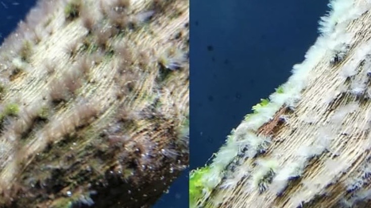 - čierne alebo tmavosivé chumáčiky na koreňoch, kameňoch a okrajoch listov – čierna štetinková riasa (BBA)