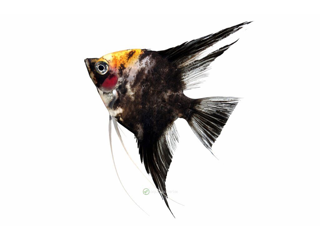 Skalár Mramorový Gold Head, známy aj ako Pterophyllum scalare Marble Gold Head, je elegantným a vyhľadávaným variantom skalára, ktorý vyniká svojím mramorovaným telom a zlatou hlavou. Jeho telo je zdobené nepravidelnými čiernymi a bielymi škvrnami, ktoré pripomínajú mramor, zatiaľ čo hlava má nádherné zlatisté sfarbenie. Tento kontrast medzi svetlými a tmavými farbami robí z tejto ryby výnimočnú estetickú atrakciu v každom akváriu. Skalár Mramorový Gold Head je rovnako pokojný ako ostatné skaláre a často je obľúbený pre svoje elegantné pohyby a pôvabné vystupovanie.